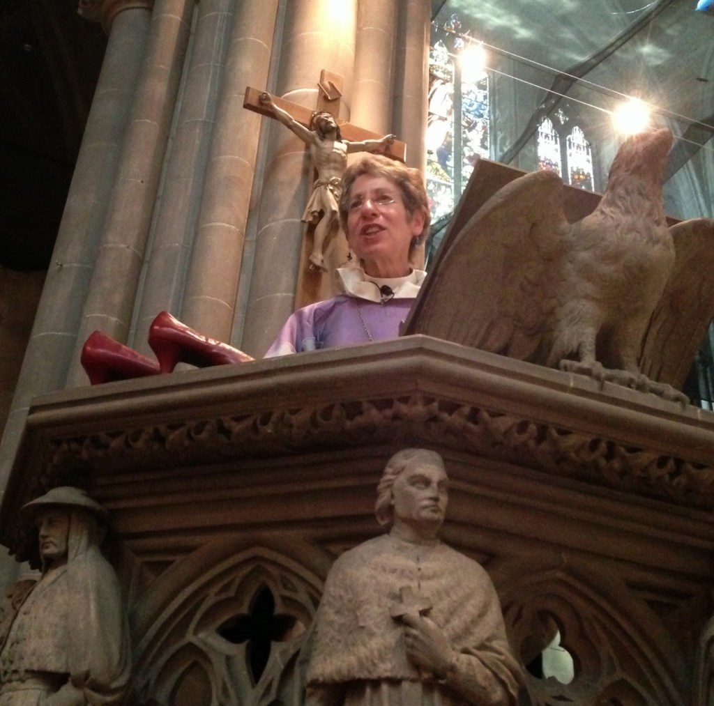 Since that first meeting, she wrote more books, and I met her at least 2 or 3 other times. One was during the 40th anniversary of women being ordained in the church. I am fortunate to live in Philadelphia, where the Episcopal Church was founded, and where the first 11 women priests of the Church became ordained in 1974. The event put the Church of the Advocate in North Philadelphia on the map as a historic site. Bishop Katharine led the service to honor the women who made her election possible. She gave a fiery sermon where she spoke of the importance of women’s shoes. After speaking of the condescending things men would say to female clergy, i.e. “Women priests shouldn’t wear heels.”, she slapped a pair of red shoes on the pulpit and said: