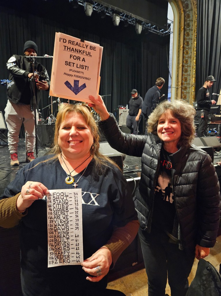After the show, I was determined to get a setlist. I never had one before, and they are sought after souvenirs. There is only a limited number of them on the stage. I came up with the clever plan of making a sign asking for one, working the Thanksgiving theme into the request. A whole bunch of us were around the stage and a crew member saw my sign and graciously gave me the one that was taped near Jamie’s mic. He said, “She has a sign, she’s got to have one.” I thanked him and wished him a Happy Thanksgiving.