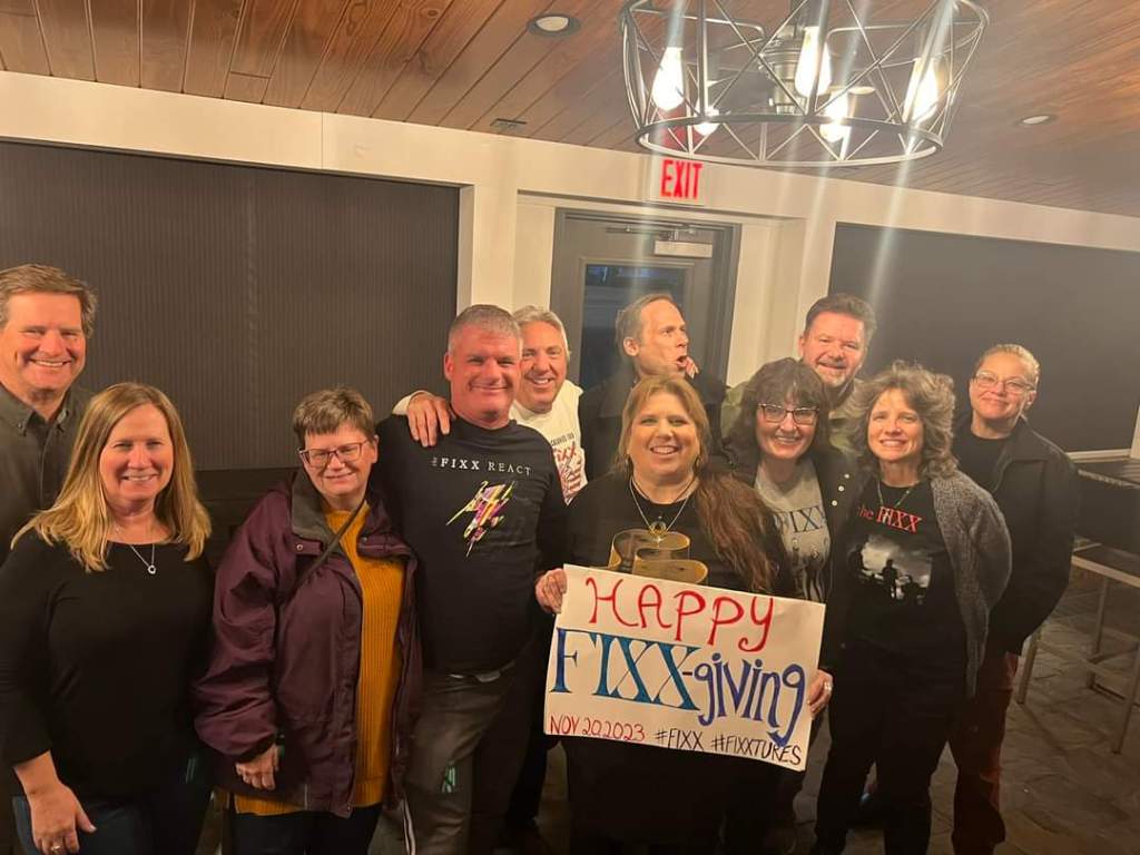 November finally rolled around and so did a freezing cold spell- temps in the 30’s at night, a contrast to the weather during the last time they were here- a humid night in August. Before the show, a group of fans that had become friendly over the Facebook fan page had met at a restaurant/bar called Jerzees for dinner before the show. We were about a dozen people, all Fixxtures– the term for the die-hard fans. We had food and fellowship. It felt not much different than the church social events I’ve been too. Everyone was friendly and casual. We talked not just about The Fixx, but our lives. A few were curious about what I do as a deacon and why I chose that path. It was a joy to talk about it. We posed for a group photo, I brought a sign and dubbed the event “Fixxgiving.”